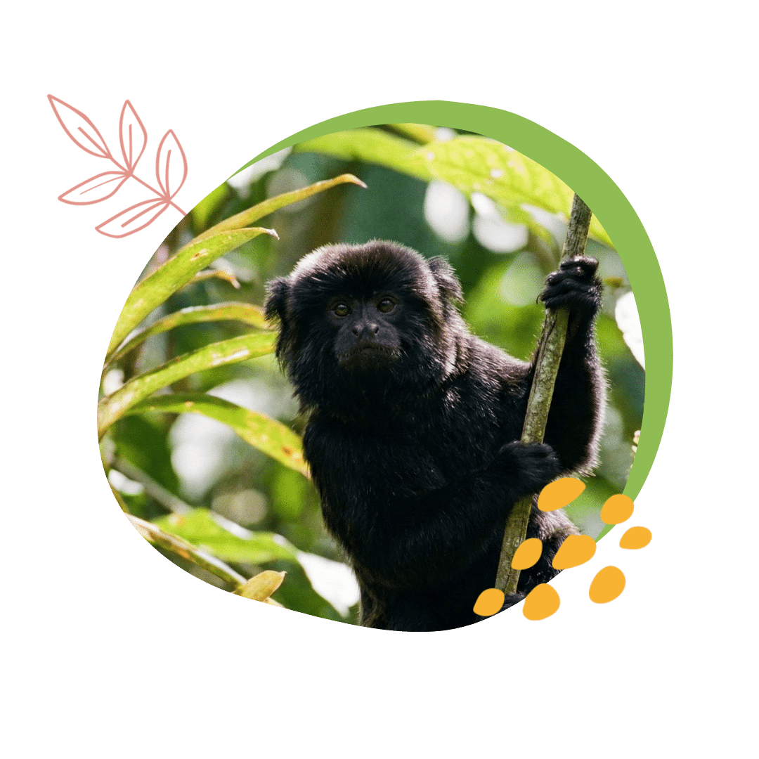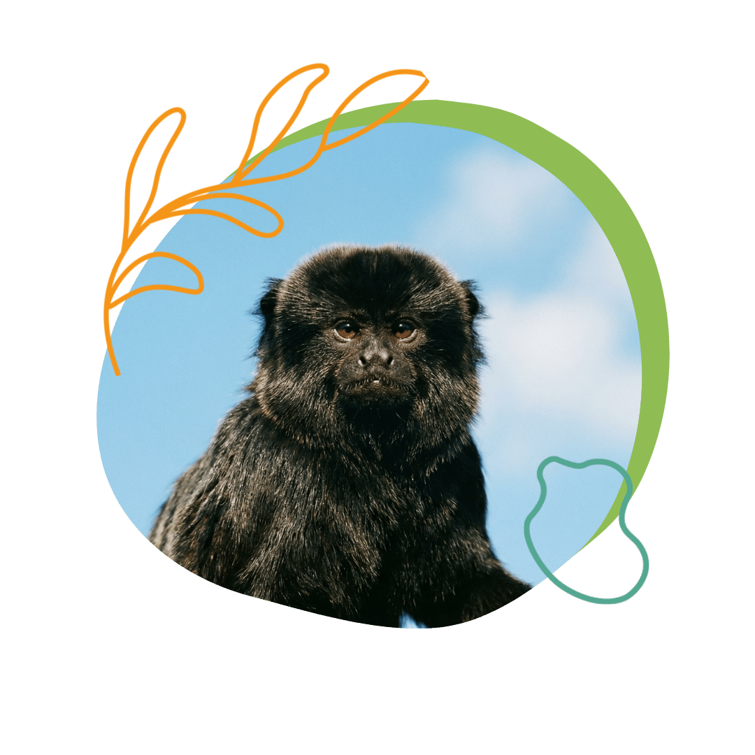 Le tamarin de Goeldi est reconnaissable par son pelage noir faisant penser à un petit gorillon. Comme ses cousins, il possède une longue queue et des doigts se terminant par des griffes.