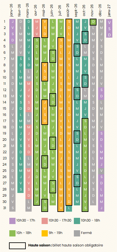 Billet à prendre en ligne minimum 3 jours avant la visite, valable uniquement le jour choisi en haute saison.